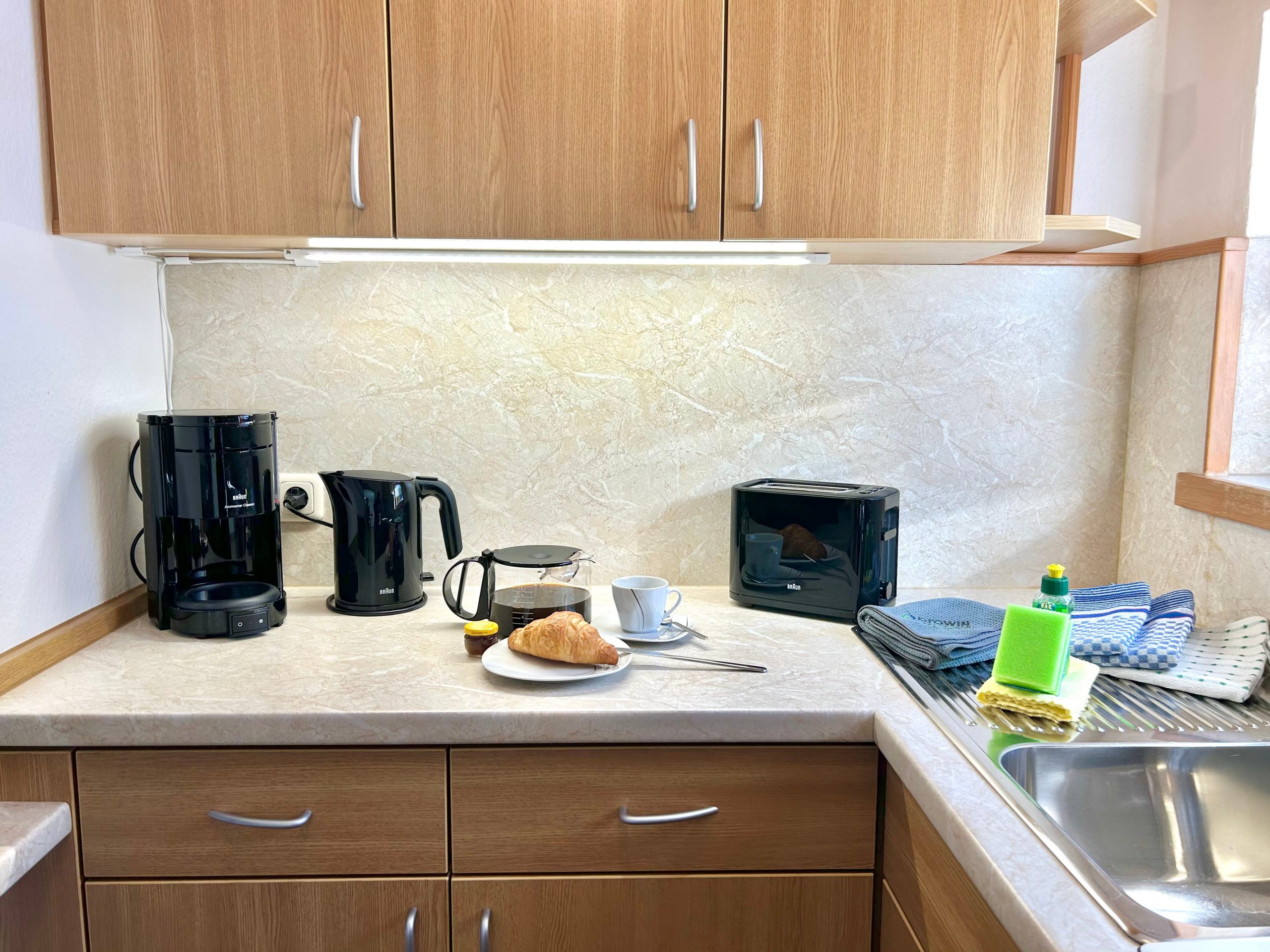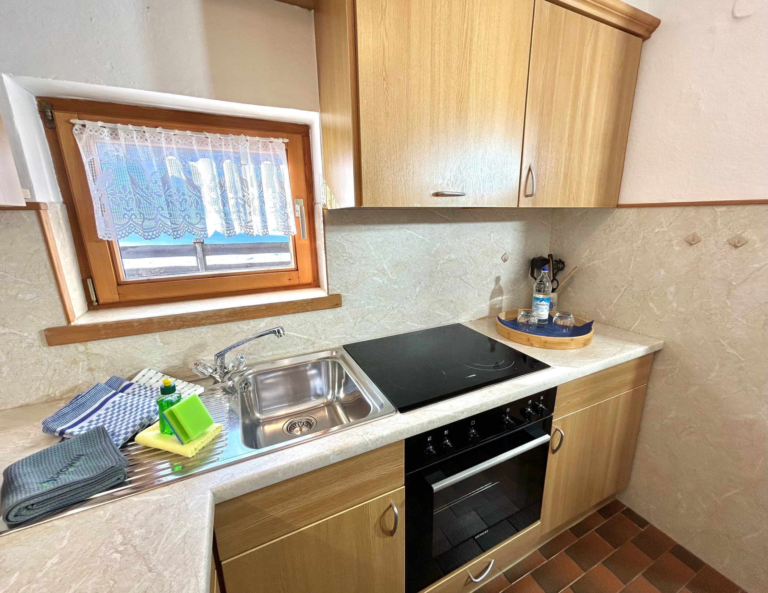 Selbstverständlich stehen Ihnen ausreichend Koch- und Speisegeschirr zur Verfügung mit Spülmittel und Geschirrtücher.
